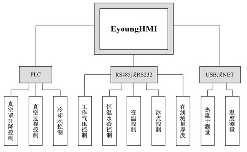 采用EyoungHMI系列人機(jī)界面集成測(cè)控系統(tǒng)可與各個(gè)單獨(dú)測(cè)控儀器、儀表和設(shè)備進(jìn)行通訊,通過對(duì)軟硬件相互配合的互鎖、監(jiān)控、在線狀態(tài)記憶、斷點(diǎn)保護(hù)等設(shè)計(jì),結(jié)合各種保護(hù)裝置,使整個(gè)測(cè)試系統(tǒng)的安全性和可靠性得到有效保證。在觸摸屏上可以直接設(shè)定各種控制參數(shù)、數(shù)字和曲線形式顯示各個(gè)儀器儀表的測(cè)量結(jié)果,并將所有設(shè)定參數(shù)、過程數(shù)據(jù)和測(cè)量結(jié)果進(jìn)行存儲(chǔ)。